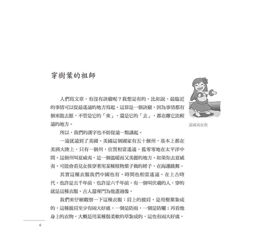 作者觀念新穎,不拘泥於一格,竟將伏羲老祖與夏威夷草裙女孩相提並論,還說造字的倉頡像極當代的前衛藝術家,他對於字詞的考證自然也就頗具創見,例如對於「春」的古字的解釋:「這個字的上面是一個有點變形的『木』字……那棵樹長得似乎有點幸災樂禍,你看它的葉子,一扭一扭的,簡直快把自己長瘋了。這麼個長法,我都擔心它長成腦震盪。這就是春天,是草木們的狂歡節。」