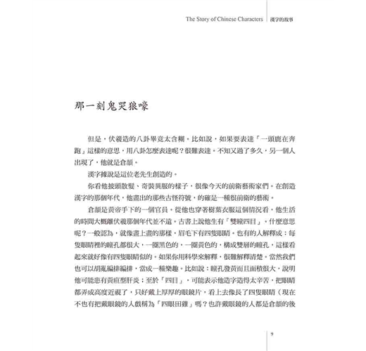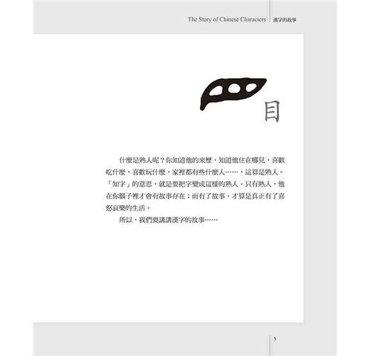 全書共介紹近兩百個漢字的「故事」,有些是單字獨挑大梁,更多則是群字共同演出。在引薦完造字的祖師爺後,本書竟以「鬼」字緊接其後,繼之以「人」字大家族,以及表達各種人事、自然與抽象事物的漢字。