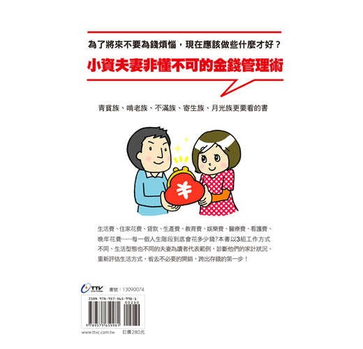 生活費、住家花費、貸款、生產費、教育費、娛樂費、醫療費、看護費、晚年花費……每一個人生階段到底會花多少錢?本書以3組工作方式不同、生活型態也不同的夫妻為讀者代表範例,診斷他們的家計狀況、重新評估生活方式,省去不必要的開銷,跨出存錢的第一步!