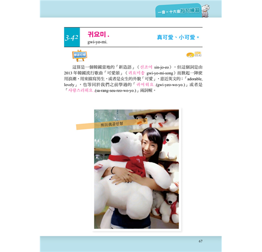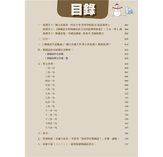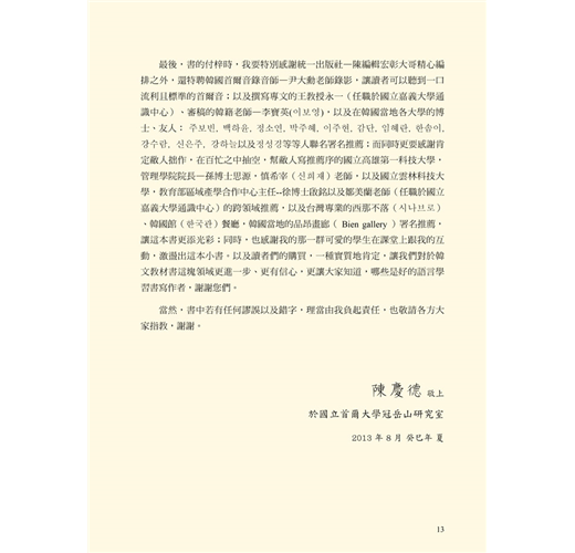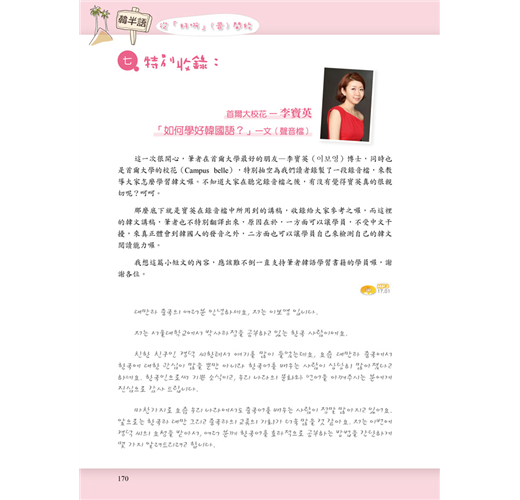 國立嘉義大學—王永一教授撰文[韓國語文 與韓國民族文化的振興與推進]專文推薦, 與國立首爾大學博士候選人—陳慶德老師特 撰[韓國語半語概論]一文,以及首爾大校花 博士—李寶英,跨刀錄製 [如何學好韓國語] 一音檔,建立學習韓國語大方向。