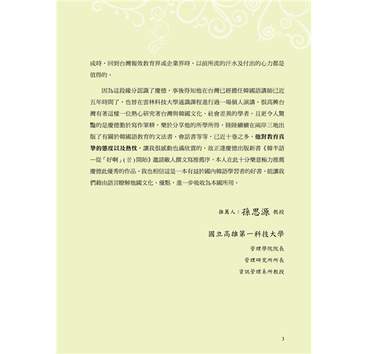 國內大學體系跨領域推薦的韓語學習書,國立高雄第一科技大學—孫思源博士(管理學院院長)、國立雲林科技大學—徐啟銘博士(教育部區域產學合作中心主任)以及國立嘉義大學—王永一、鄒美蘭(韓語老師)老師強力推薦。