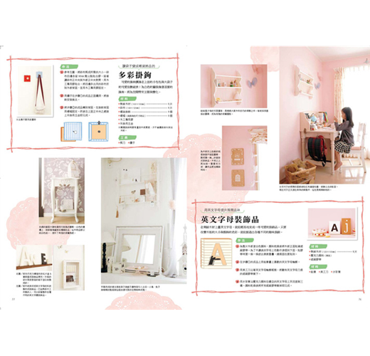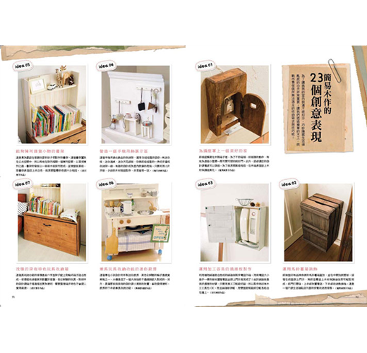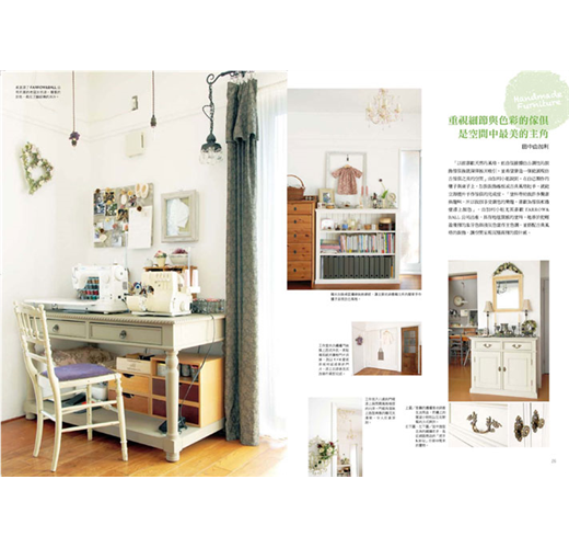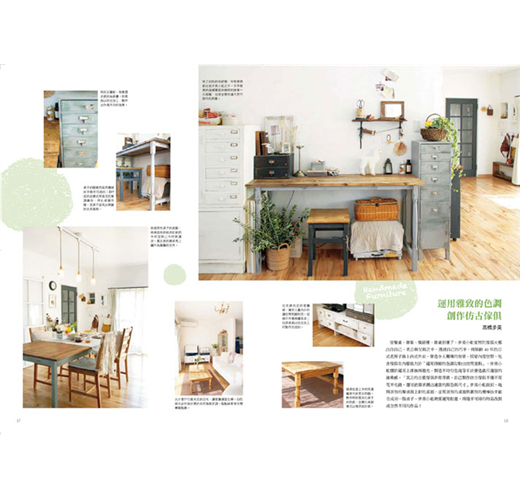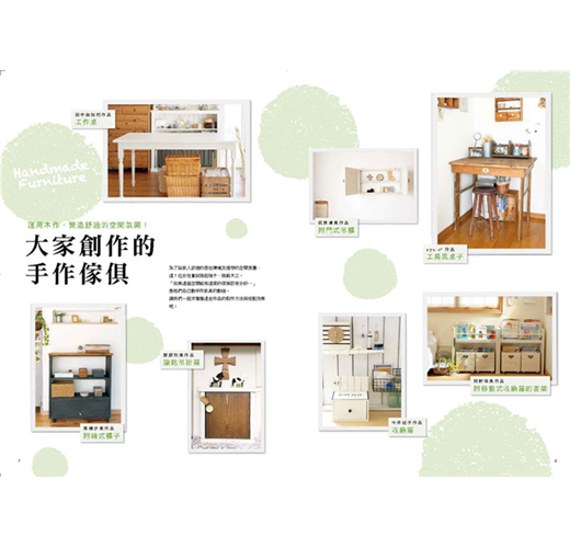 舉凡客廳、餐桌、廚房、小孩房、玄關等空間會用到的傢俱,都有詳盡的圖解說明,透過書中的傢俱樣式,還可一窺現在日雜風仿古、天然、以及鄉村風格所流行的樣式。