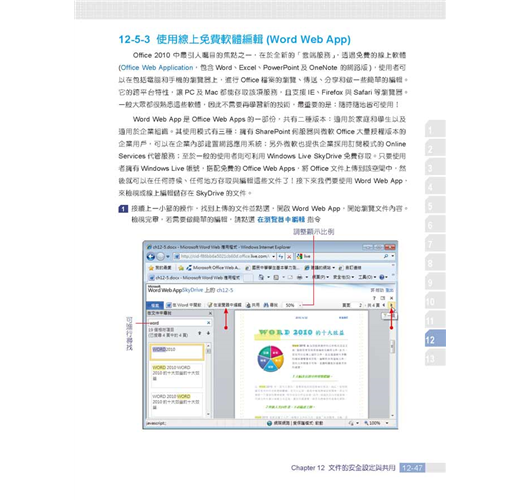 本書以實例為主軸,介紹字元與段落的格式設定、樣式的套用與設定、製作表格、圖形物件的美化與安排、版面設定、製作目錄、使用範本、文件的追蹤與修訂、檔案的傳送與共用、合併列印…等使用技巧,再搭配上Word 2010視覺化的結果導向使用介面,讓您不需要強背指令,彈指間即可輕鬆應用到所學的各領域上。