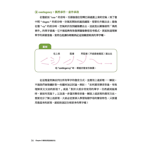 用箭頭符號以及發音圖示,明確描繪出30個介系詞的用法;正確使用介系詞,就是精通英語的致勝關鍵!例如,“at” 的發音如同「用針刺到的感覺」,漸進式的集中方向於一點,所以 “at” 代表「往~方向,在~」之意,就好像對準某一個對象不偏不倚地扎一針,表現出動作的準確性。(精彩圖像內容請見本書P.105。)