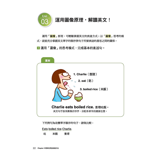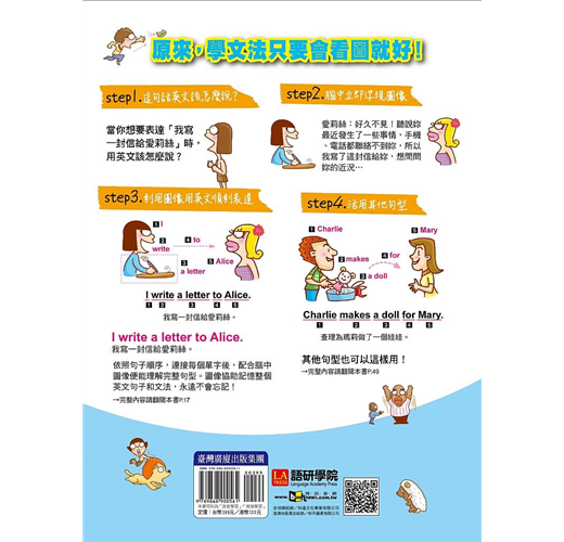 當你想要表達「我寫一封信給愛麗絲」時,用英文該怎麼說呢?文法老師會教你「主詞+動詞+受詞」,但如果你學會本書的教學方法,此時腦海中就會浮現「提筆寫信」的相關圖像,只要依圖像順序來連接每個單字,便能下筆寫出完整的句型。用圖像協助記憶整個句子與文法,永遠都不會忘記!(精彩圖像內容請見本書P.18。)