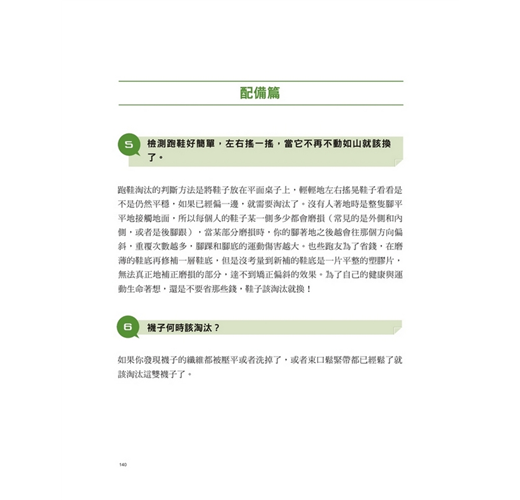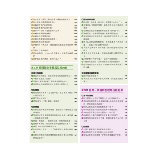 超過300個問題與要訣,郭老師依據「跑者程度」分門別類,再細分為「基本知識篇」「配備篇」、「訓練篇」、「體能與修復篇」、「疑難雜症與賽事篇」,知識與概念部分以文字、照片與圖解為你解惑,訓練部分配合靜態與動態示範要你一目瞭然,郭老師就是你家中的跑步教練!