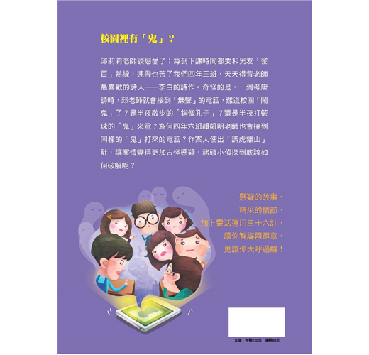 邱莉莉老師談戀愛了!每到下課時間都要和男友「黎百」熱線,連帶也苦了我們四年三班,天天得背老師最喜歡的詩人——李白的詩作。奇怪的是,一到考唐詩默寫時,邱老師就會接到「無聲」的電話,難道校園「鬧鬼」了?是半夜散步的「銅像孔子」?還是深夜打籃球的「鬼」來電?為何四年六班顏凱明老師也會接到「鬼」打來的電話?作案人使出「調虎離山」計,讓案情變得更加古怪懸疑,豬頭小偵探到底該如何破解呢?