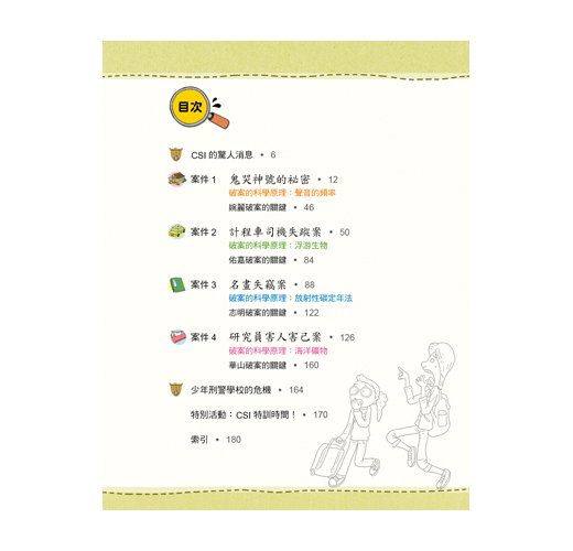 6. 每冊都有特別活動「CSI特訓時間!」,利用案件中所運用到的科學知識所設計的科學活動,讓讀者自己動手玩科學,不只好玩、有趣,更能加強學習。