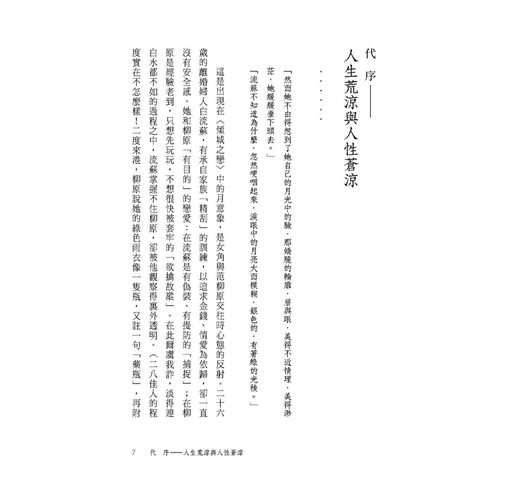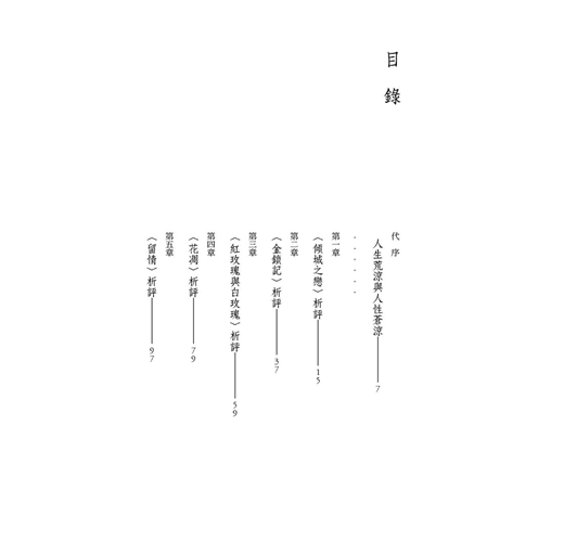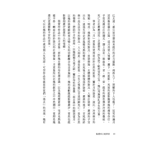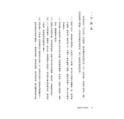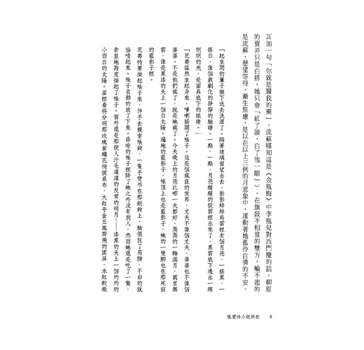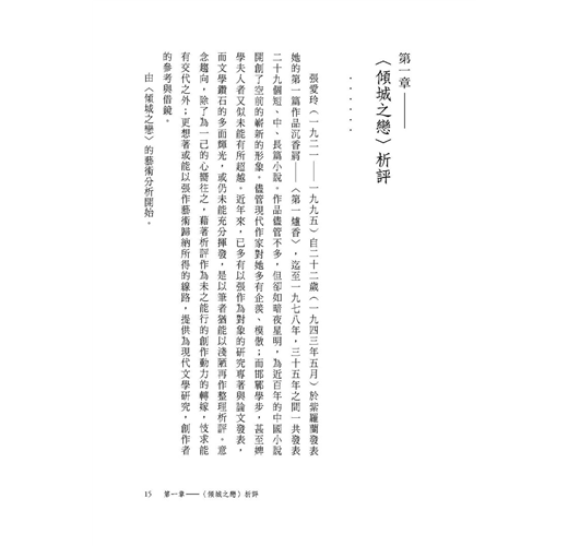 書中作者針對張愛玲〈傾城之戀〉、〈金鎖記〉、〈紅玫瑰與白玫瑰〉、〈花凋〉、〈秧歌〉、〈赤地之戀〉、〈半生緣〉、〈色.戒〉、〈小團圓〉等膾炙人口的作品,發表其獨到的見解,並從形、喻、意象、手法等不同的角度,來分析張氏文學,感受出其厚植的評析實力。