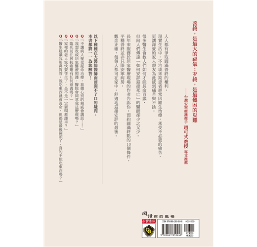 無論用什麼名銜,如:「平穩善終」、「自然死」、「尊嚴死」、「善終」等,都不是「安樂死」,絕不提早病人的自然死期,而是協助病人在自然死亡過程中,提升生活品質與死亡品質。既不醫療不足草菅人命,也不醫療過度。這是現代人皆須重視的課題!本書中有精闢的說明,值得細讀!畢竟「善終,是最大的福氣;歹終,是最艱困的災難!」