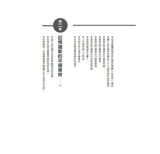 1.「第一個平穩善終的條件」——維生治療一旦開始,便很難中途停止,即使本人或家屬要求也一樣: