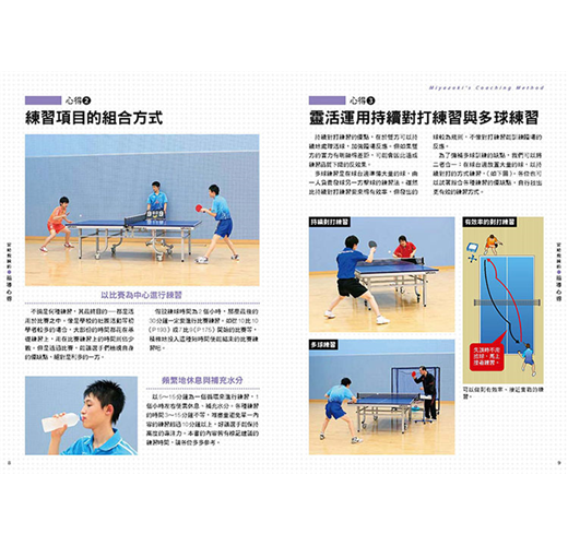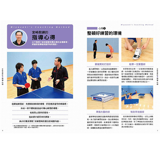 宮崎教練對於桌球的謹慎態度,從首章他為指導者與選手整理的練習注意事項中就看得出來,包括有效率的整頓練習環境、以比賽為目標進行練習,靈活用運持續對打的練習及多球練習,以及系統式的練習……,提點選手們要注意禮貌、留意自己的身體狀態、並隨時注意補充水份等等,即使是一個簡單的小細節,都能看出宮崎教練細心與專心。特別推薦給所有想增進桌球實力、讓自己更上一層樓的球友們。