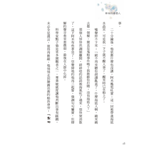打開「氣泡人」書稿,清基被懸疑、探險的故事深深吸引,一口氣讀完全書,好期盼書中的主人翁-點子倫是我,那麼我就可以率領探險團隊,賞玩海上明媚風光、挑站颱風天行船、經歷狂風巨浪、探訪奇妙仙境,見識《神秘的海底人》與「水書」、潛游於「海湖祕道」、最後還能代替點子倫留在桃花源中,歡度餘生呢。