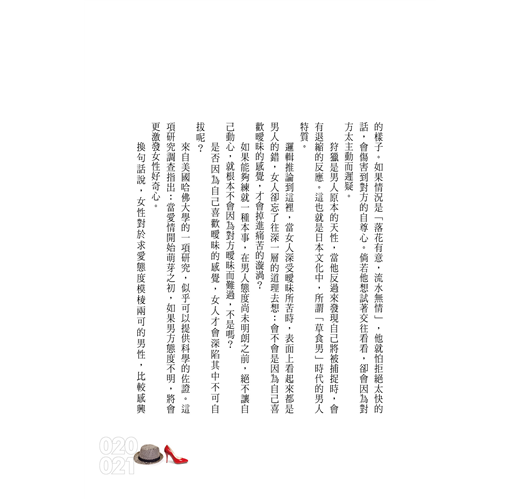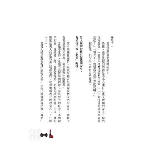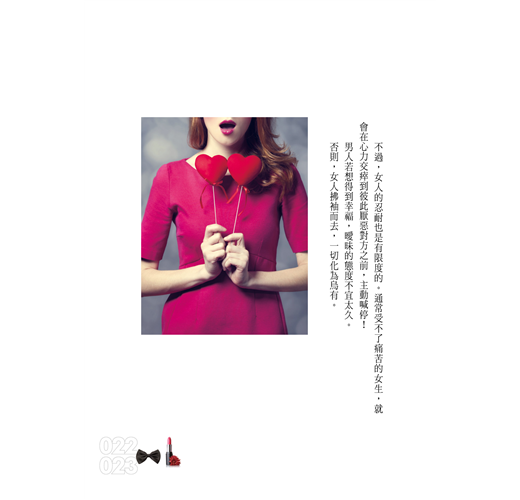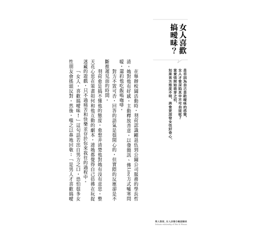 邏輯推論到這裡,當女人深受曖昧所苦時,表面上看起來都是男人的錯,女人卻忘了往深一層的道理去想:會不會是因為自己喜歡曖昧的感覺,才會掉進痛苦的漩渦?