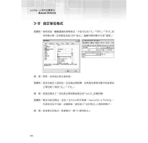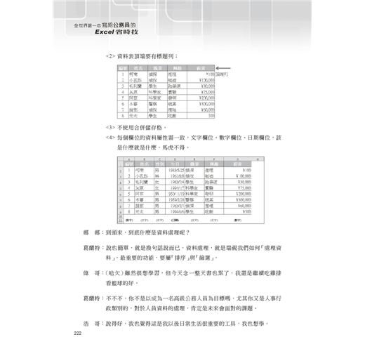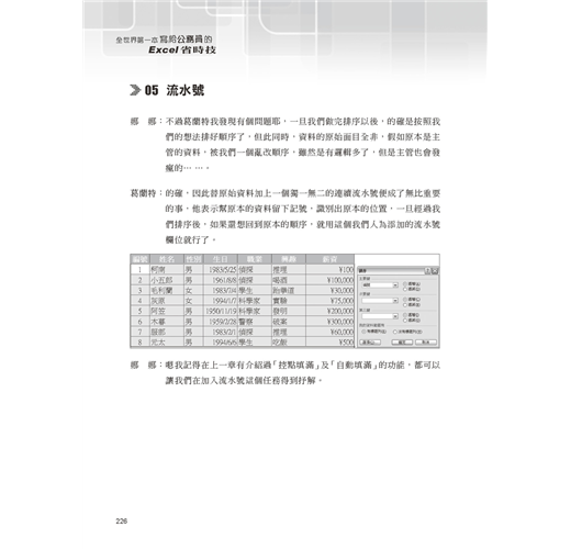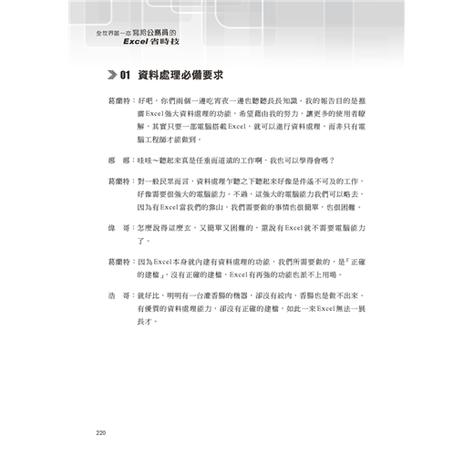 一聽到書名就覺得滿有趣的,原來終於有人為我這樣的公務人員出版Excel書籍了啊!故事情節真不是蓋的,活生生的公務員生活躍然紙上,輔以詼諧的精彩對話,將Excel的精華流露於無形。以後我會推薦給我的同事,也希望其他如Word、Powerpoint等系列也能快快問世。