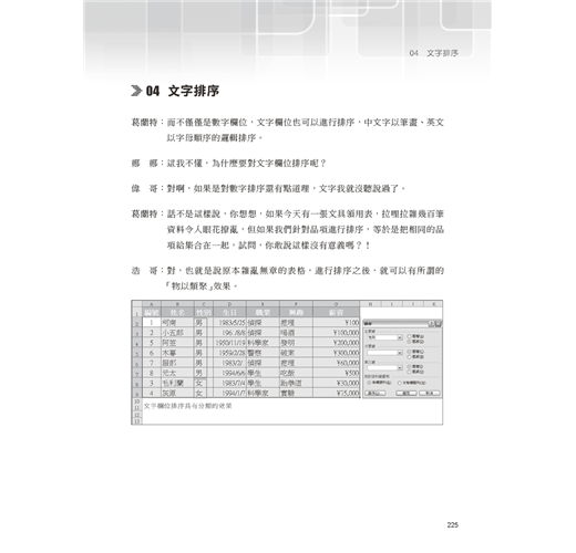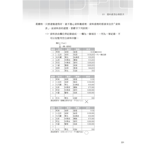 這本書的第三章讓我想起以前求學時期邊做報告邊翻閱Excel工具書的情景。那時為了進行項目的運算分析,得對成千上萬筆的資料進行處理,偏偏沒受過這方面訓練的我,只能和小組成員討論與查找相關書籍,那時候我們的第一選擇,的確就是最普及也最容易上手的Excel。現在想想,如果當時就具備基本的資料庫處理觀念,或許報告能夠做得更快更好。