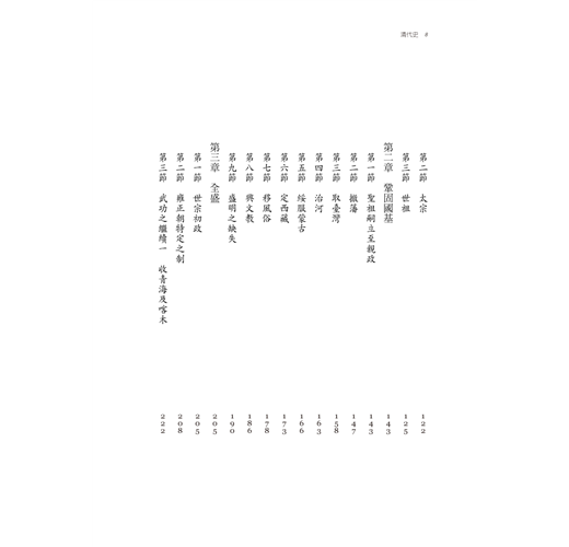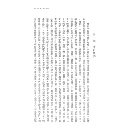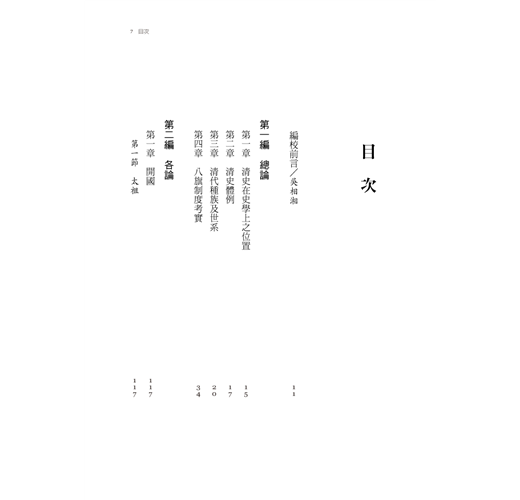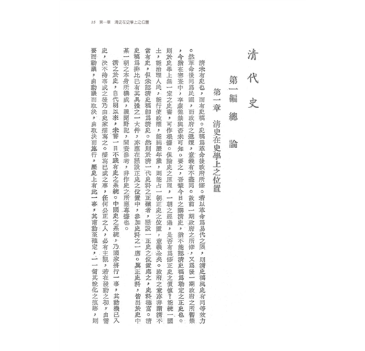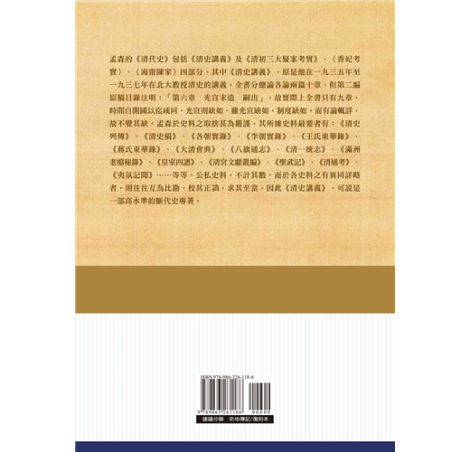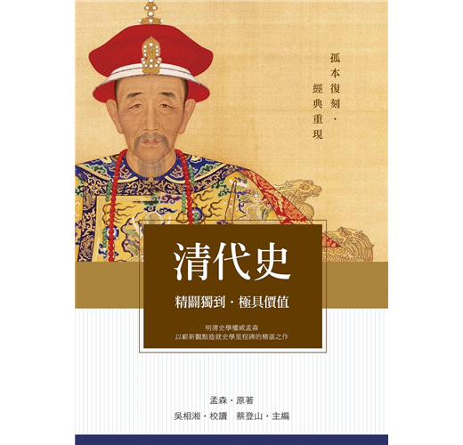 孟森的《清代史》包括《清史講義》及《清初三大疑案考實》、〈香妃考實〉、〈海甯陳家〉四部分。其中《清史講義》,原是他在一九三五年至一九三七年在北大教授清史的講義,全書分總論各論兩篇十章,但第二編原稿目錄注明:「第六章 光宣末造 嗣出」。故實際上全書只有九章,時間自開國以迄咸同,光宣則缺如。雖光宣缺如,制度缺如,而有論輒詳,故不覺其缺。孟森於史料之取捨甚為嚴謹,其所據史料最要者有:《清史列傳》、《清史稿》、《各朝實錄》、《李朝實錄》、《王氏東華錄》、《蔣氏東華錄》、《大清會典》、《八旗通志》、《清一統志》、《滿洲老檔秘錄》、《皇室四譜》、《清宮文獻叢編》、《聖武記》、《清通考》、《夷氛記聞》……等等。公私史料,不計其數。而於各史料之有異同詳略者,則往往互為比勘,校其正譌,求其至當。因此《清史講義》,可說是一部高水準的斷代史專著。