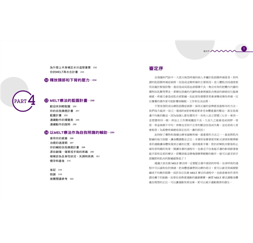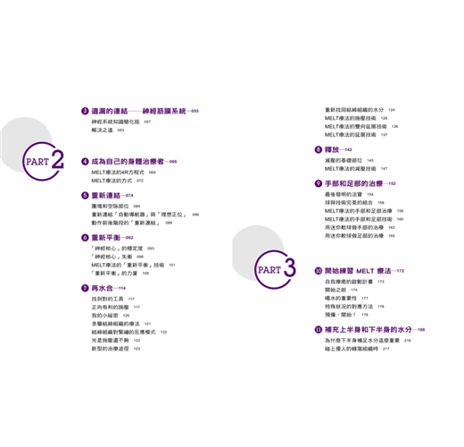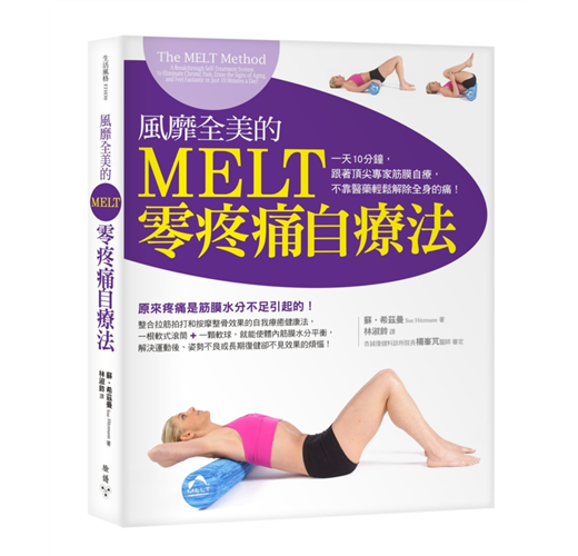 當然不可能每天都花錢找人按摩,因此自主按摩就成為我的最佳選擇。一開始只是花錢跟老師學習用泡棉滾筒來自主按摩的動作,像是如何按摩臀部、前大腿、後大腿、小腿……等。但為什麼要按摩、該怎麼按該怎麼摩,以及背後的原理與目的其實都是一知半解。透過蘇.希茲曼在《MELT零疼痛自療法》中有系統的講解過後,讓我更清楚明白原來按摩不只是按肌肉,還含括「結締組織」和「神經系統」兩大部分,我也才知道「失去延展性」與「脫水」的結締組織是肌肉拉傷與關節過度緊繃的主因。