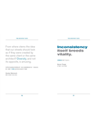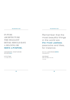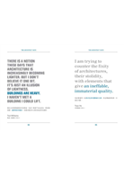就像是穿越劇的晚餐派對在紙頁上搬演,一位當前建築大師的身旁,也許就坐著作古多年的18世紀前輩建築師,或者同世代的建築師相互呼應其觀點,104位在各自世代、各擅勝場的建築大師們齊聚一堂,對談、對嗆、相互引申與呼應各自的觀點。