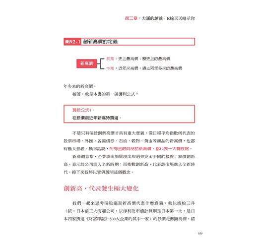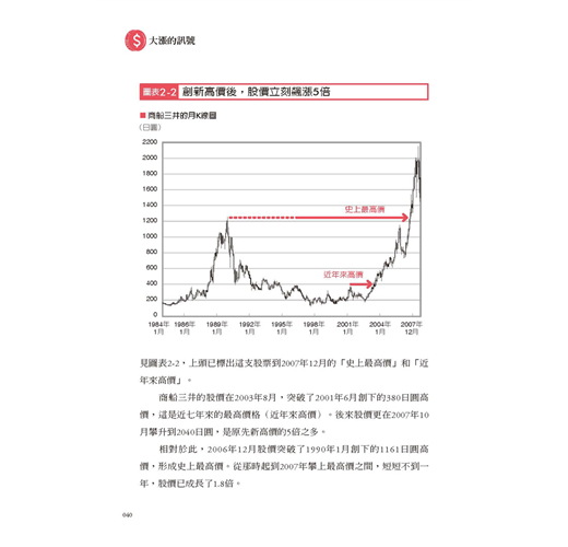 個人進行證券市場工作初期,曾聽一位前輩說,股價創新高需有革命般的熱情,具有較大的上漲潛力,這段話至今記憶猶新;本書的內容雖以日股為例,但投資原則放諸四海而皆準,在近二十年多年台股歷史中,隨著產業趨勢波動與榮枯,每段時間就會出現新股王,可說江山代有「好股」出,而這些不斷創新高的領導股,大都是當時的明星產業,且都伴隨著獲利大幅成長,很符合作者的選股標準。即便近兩年台股陷入箱型震盪走勢,也有相當多股價創新高、業績大幅成長的傳產股(如自行車、超商、汽車相關、成衣、隱型眼鏡等),投資人如依此方法選股,都有豐碩的投資報酬。