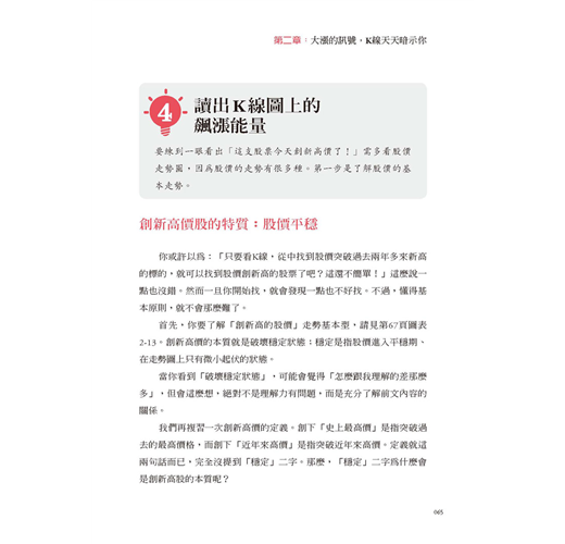 不過,真正產生推薦本書的動力是在閱讀書稿後,從書中感受到作者無私分享自己在股市多年的實戰經驗,雖然投資只有一個「買」或「不買」的決定,但是該怎麼買?怎樣辨別型態可以買的情況?以及最後要怎麼賣?這是絕大多數投資人非常苦惱的問題,而作者能夠將這些情況做有系統的整理,成為一般普羅大眾都能輕鬆上手的投資書籍,實在難能可貴。