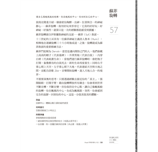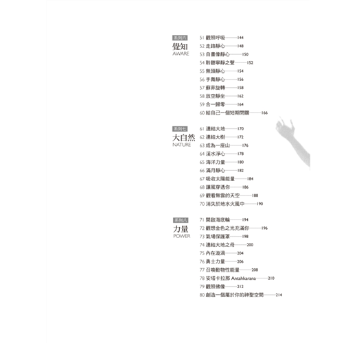 這些古老而不過時的優雅技巧,是許多前人遺留下來的智慧與寶藏。寫這本書的目的,就是要提供給你在眾多簡易、實用又有趣的多元性靜心技巧中,選擇對你目前生命狀態最有幫助的方法,能夠讓你安心在家中自行練習,餵飽你的心靈。