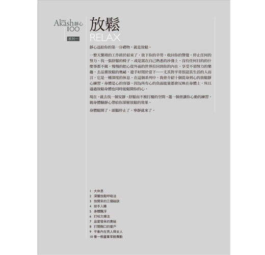 你可以在《Akash阿喀許靜心100》這本書中讀到他的愛、智慧與幽默,如果你需要一個好的靜心老師,阿喀許是個絕佳選擇。
