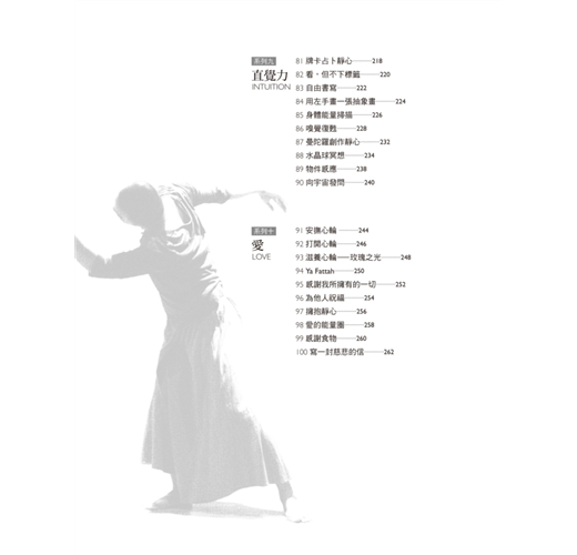 這本書裡面有100款不同的心靈菜單,它們來自眾多成道師父的教導,以及我過去二十年遊歷世界各地學習不同派別種類的「名菜」。有經典傳統的、有現代的、東方的、西方的、充滿異國情調的,也有許多鮮為人知但絕對是美味無窮的菜餚。
