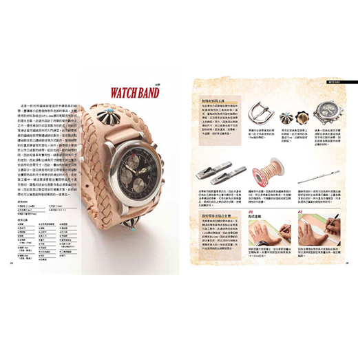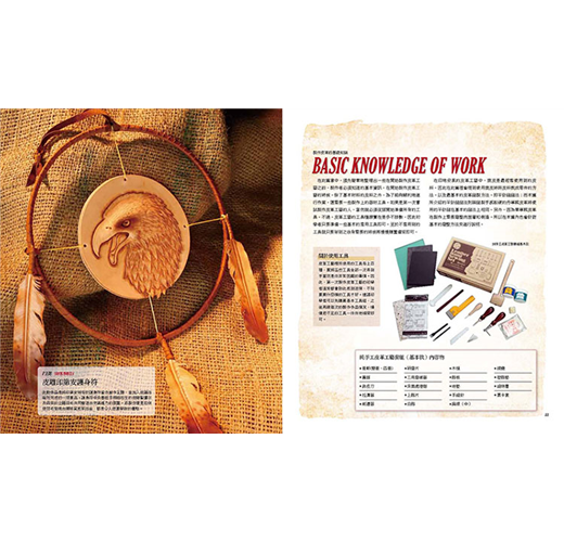 書中所收錄的作品,包含:方便收納鑰匙、卡片等小物品的腰包;擁有寬版背帶的麋鹿皮肩包;帶有精緻的皮雕裝飾、充滿粗曠風格的錶帶;紙鈔和卡片都可方便收納的三折長夾;皮革作品中不常看到的帆船鞋,以及用皮雕手藝雕出栩栩如生老鷹圖案與羽毛的皮雕裝飾等,可說是種類特別豐富的一本皮革製作集。