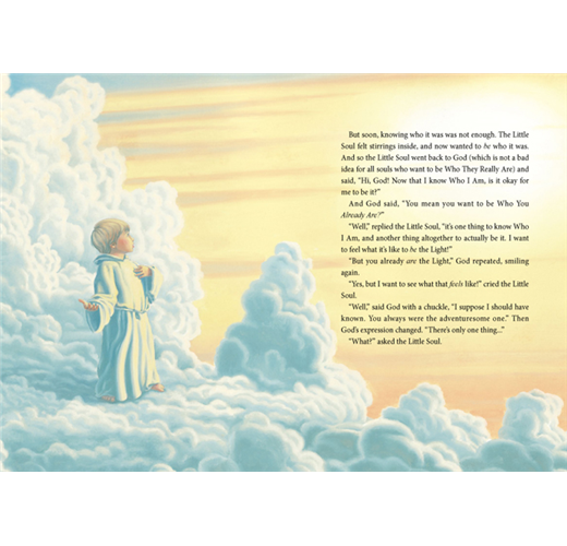小靈魂想親身體驗自己是誰,這是一趟小靈魂的冒險之旅,就跟我們在地球上所經歷的冒險非常相似。在出發之前神提醒小靈魂:「你要永遠記得,我派遣給你的,都是天使……」