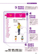 本書共列出近300種英文句型,每個句型補充十個左右的替換單字,讓讀者學一種句型,就可自由替換。例如:「Do you like baseball?」(你喜歡棒球嗎?)此句型中的「Do you like…?」(你喜歡…嗎?)即可替換成許多不同的單字,如「Do you like tennis/bowling/golf?」(你喜歡網球/保齡球/高爾夫嗎?),在簡單的替換之下,英文頓時變得簡單易懂。而本書也特別結合了圖像+單字+句型,三效合一的學習法,每個主題都搭配情境彩圖幫助句型記憶,還可利用插圖輔助記憶單字,讓讀者以「圖像」記憶「單字」,以「單字」套用「句型」,書中生動的情境彩圖與插圖,利用圖像聯想快速加強記憶,每組單字大情境圖幫助句型記憶、小圖輔助記憶單字,充分利用人類左右腦特性,最適合忙碌的現代人,結合圖像與單字,不用死背也能輕鬆記牢。並以「主要單字」衍生「相關單字」,「擴散式的學習法」,讓讀者不用動腦就能簡單串聯。