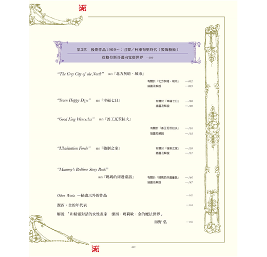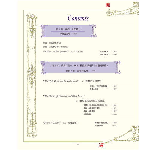 本書依據年代編排,將潔西‧金從少女到晚年的作品做一完整的介紹,早年的畫作以線條為主,她喜歡描繪中世紀的歌謠,筆下的少女憂鬱而纖細,到了後期,步入婚姻的潔西‧金,受彩色玻璃創作家的丈夫,以及野獸派的影響,作品中開始出現鮮艷亮麗的色彩。