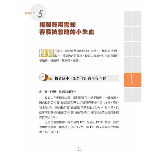 第三篇則說明台灣民眾最偏愛的9種基金。除了介紹其性質外,也具體說明其操作方法。當然有其中3種作者根本不建議民眾投資。