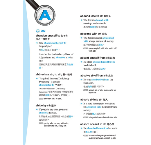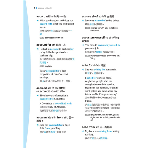 簡明正確:以簡單明瞭的方式呈現片語用法,明確區分「可分離」與「不可分離」片語,與主詞、受詞的「選擇性限制」。例句裡特別呈現該片語在句中的用法與意義,以讓讀者學習從上下文中來記憶片語,比較容易,也比較有意義。