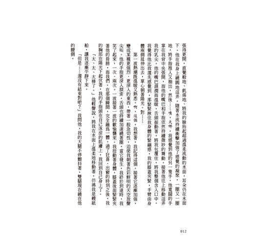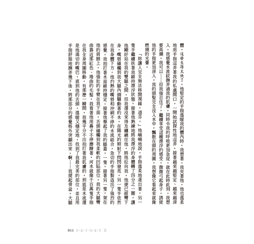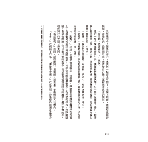 「要命!」他喃喃地說,頭往後仰,視線固定在她的雙手、手指上。他想要觸摸她,伸出手碰她,但是他沒辦法。就連我都感覺得到他的挫敗感,他受撩撥的反應也撩撥了我,我先前從沒有這樣的感覺,我沒有看過很多情色影片,也不是個偷窺狂,但是這……這太強烈了,而且火辣。我在單人沙發裡往下沉了一點,因慾望而酥軟。