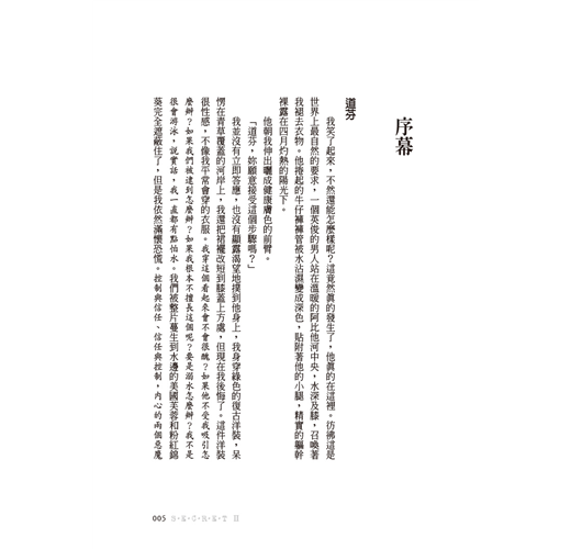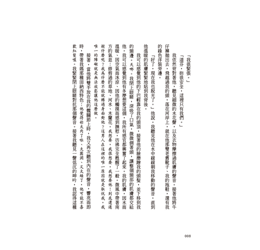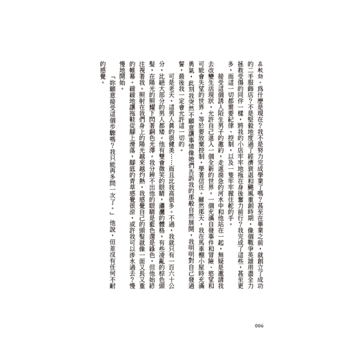 左邊的那扇門,是銜接我剛剛和馬蒂妲一起穿過的走廊,馬克從那扇門緩緩走進來,臉上帶著一抹微笑,當他看見他的「講師」時,臉上的笑容又更開了。他看起來既可愛又乾淨,身上穿著格紋襯衫,塞進寬寬的燈心絨褲內,他的頭髮潮濕,我彷彿可以聞到他的青蘋果洗髮精香氣。