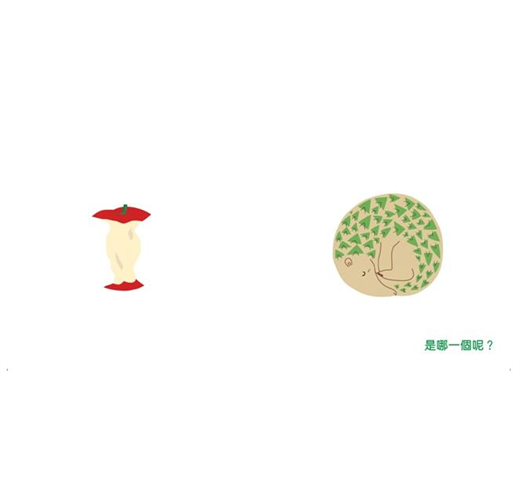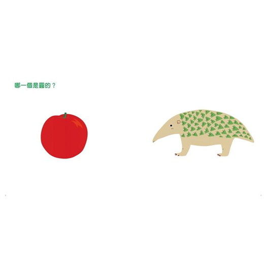 蘋果和犰狳(ㄑㄧㄡˊ ㄩˊ)「哪一個是圓的?」,還沒翻到下一頁時,大家心裡的答案肯定是蘋果。結果呢?哎呀!被啃到只剩一點的蘋果和捲成球狀的犰狳,到底哪一個是圓的呢?