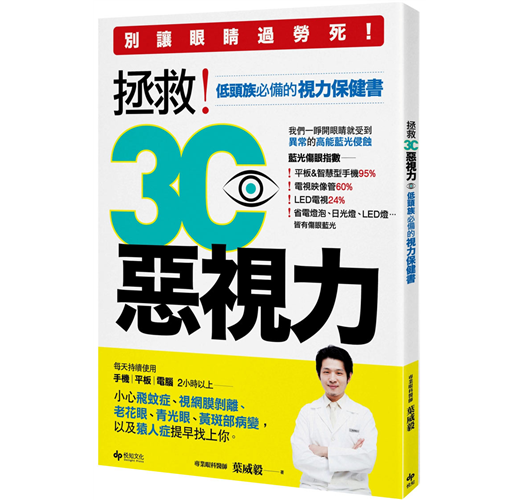 現任大學眼科集團主任醫師以及新光醫院眼科兼任主治醫師,長期關注現代人眼睛疾病的研究,曾參與過多場視力保健相關的專題演講。因為有感3C產品充斥著現代人的生活,導致許多人視力提早老化受損卻不自知,便希望透過此書告訴讀者,正確的護眼知識及保健習慣,免於3C惡視力無形的慢性傷害。