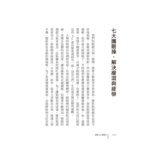 改善惱人的電腦視覺症候群,眼睛痠脹、乾澀、疲勞、對不到焦,勤做視力保健操和穴道按摩,就能擺脫不適感。