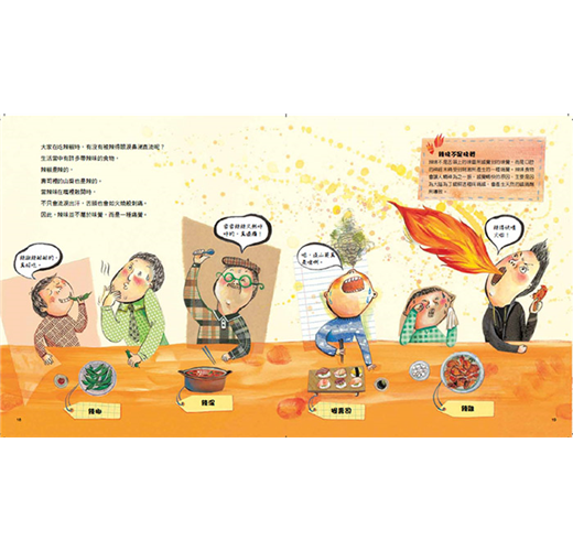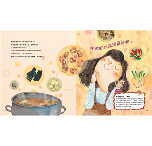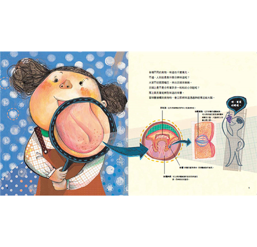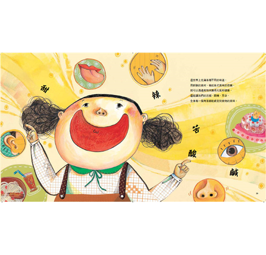認識人體對於食物的各種刺激與反應,也能引導孩子們認識各式食物的味道和相關知識,進而幫助他們攝取多樣化的食物種類。書中也附加說明了食物所帶來的各種味覺以及其中的好與壞,讓我們能了解食物均衡攝取與適當飲食的重要性。