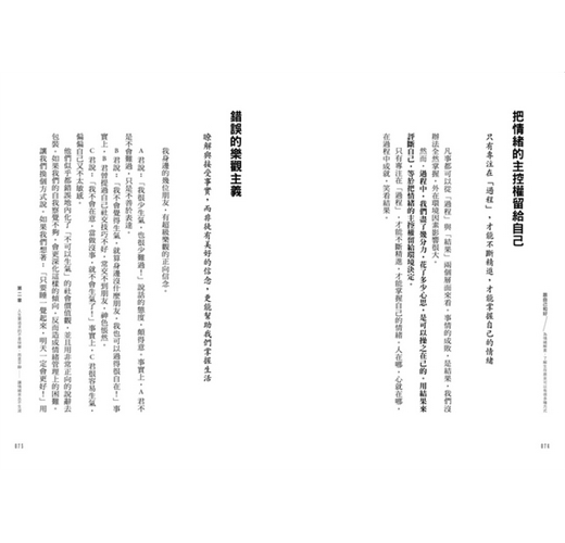 接著他談到了情緒的關照。我特別欣賞此部分的章節。台灣社會對於情緒的概念十分偏頗,總是將情緒經驗侷限在某一向度,若是經驗到所謂的負向情緒,就加以糾正、責備、撻伐、規勸,以一種幾乎是不人道的方式要人拼了命的積極樂觀。然而,人生並非如此,在生命的安排中,有時候我們需要沉澱、需要停止、需要整頓,這些都需要透過不批判的態度來體會情緒經驗,並溫和地允許情緒有一個空間被承接、被認識、被轉化。