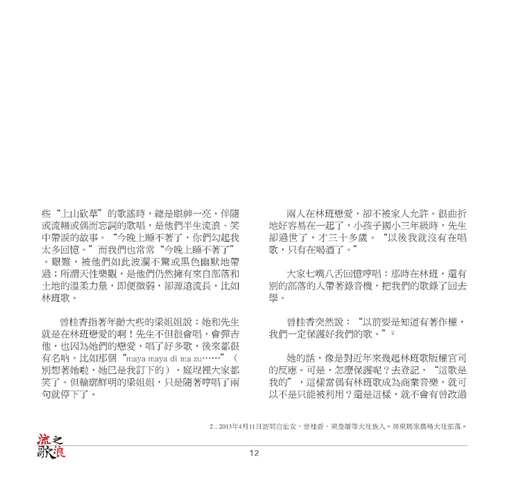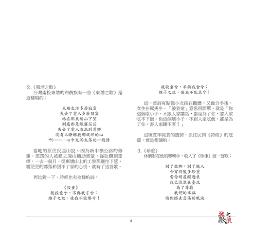 1950-70年代,在伐木外銷爭取外匯政策下,部落族人受雇在“林班”做育苗、砍草、整地的工作,開始了現代意義上的貨幣勞動。於是,在單調的勞動工作中產生了一種歌謠:它從部落的旋律和腔調而來,逐漸以新學習的國語為主,跨部落、跨族群地流傳;又從部落的篝火旁,唱到城市的工地中、唱到遠洋的漁船上,唱著思戀和流浪。