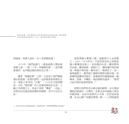 它的歌詞直白,卻孕含了半個世紀的悲歡離合;它的曲調簡短,卻融匯了千年古調、日本演歌、西洋民歌及流行音樂的元素;它是一無所有的勞動者的慰藉,也是回顧來路、思考未來的武器。這些歌謠,烙印著原住民族從氏族傳統走入民國的“現代化”足跡。究其起源,我們稱之為~林班歌謠。