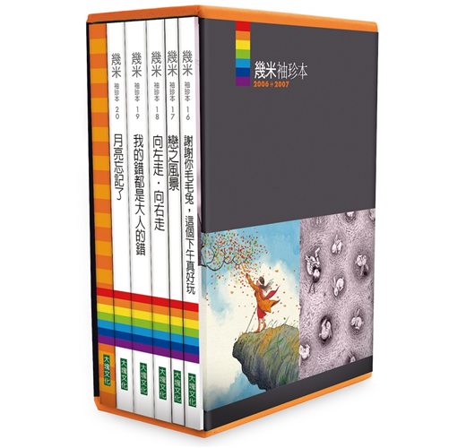 ◎《幾米袖珍本2006→2007》套書包括幾米多本膾炙人口廣受歡迎的作品:《謝謝你毛毛兔,這個下午真好玩》、《向左走‧向右走》、《戀之風景》、《我的錯都是大人的錯》、《月亮忘記了》等五部繪本,並加贈一冊由此五部繪本衍生的筆記書。