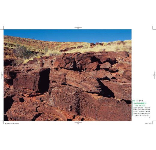 配合他田野調查的時期,我請他帶領我前往澳洲西北部皮爾巴拉地區。皮爾巴拉保存著35~25億年前的地層,是地球上極稀有的地區。在那裡我看到燧石、枕狀熔岩、疊層石、條狀鐵層等地形,令人吃驚的是那些岩石都還很新鮮。日本最古老的地層約在4億年前,由於被斷層截斷,而且風化嚴重,所以只能勉強作為專家研究的對象,無法進行拍攝。而皮爾巴拉的地層比日本老近十倍,卻有如日本新生代地層般條理清晰,地層的連續性極佳。這樣一來,前寒武紀時代的攝影終於有了著落。