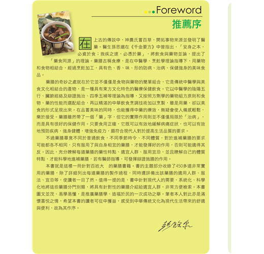 本書就是這樣一冊針對百姓大衆的藥膳書籍。書的主題部分收錄了450多道非常實用的藥膳,除了詳細列出每道藥膳的製作過程,同時還詳備出該藥膳的適用人群、服法、宜忌等,使讀者一目了然。值得一提的是,書中針對現代人的需要,系統化、科學化地將這些藥膳分門別類,將具有針對性的藥膳介紹給適宜人群,非常方便檢索。本書圖文並茂、易學易懂,是推廣藥膳學、造福於民的一次成功之舉。筆者本人對此亦是滿懷喜悅之情,希望本書的讀者可從中獲益,感受到中華傳統文化為現代生活帶來的舒適與便利。