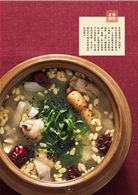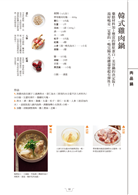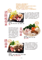 保暖身體的咖哩鍋、消除焦躁的番茄鍋、促進消化的藥膳壽喜燒、美肌護髮的蘿蔔豬肉清爽鍋、淡斑美顏的韓式雞肉鍋、提升代謝的鱈魚豆漿鍋、強健肝臟的烏賊泡菜鍋、減肥排毒的蝦肉餛飩鍋、改善貧血的黑鮪魚香蔥鍋、抗癌活血的法式海鮮鍋、排毒健胃的菊花豆腐鍋、改善便祕的山藥丸子鮮菇鍋、腸胃調整的野菜涮涮鍋、美膚防老的蛤蜊高麗菜鍋、元氣補充的銀杏鯛魚鍋……