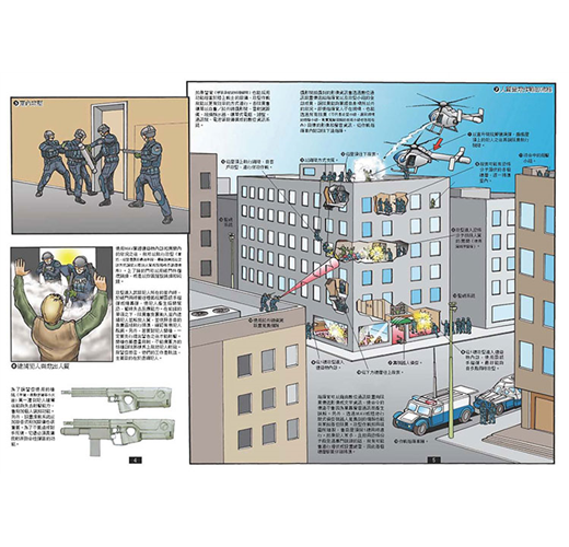 ● 主動反擊:說明特戰隊員、軍隊、警察的個人裝備及任務,與人質解救作戰策略規劃。
