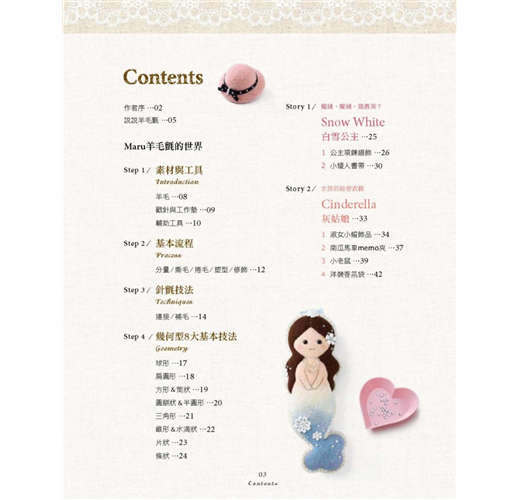 本書介紹各款童話故事裡的羊毛氈作品、各式技巧分解,及作者獨家的採買小祕笈,讓有興趣的朋友輕鬆學習羊毛氈,感受來自羊毛氈的幸福與溫暖,並在羊毛氈創作裡找到樂趣及創作出自己的風格。