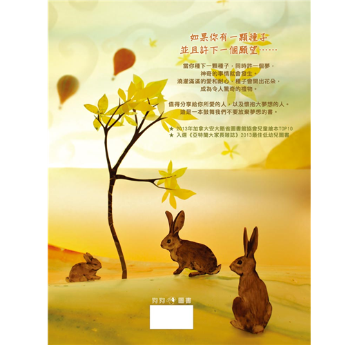 小男孩擁有一顆種子。當他把種子埋在泥土裡之後,將會有什麼樣的變化?經歷了春、夏、秋、冬,經歷了一季又一季,經過了一年又一年,小種子發芽、茁壯,成長為一棵大樹,小男孩也成長為大人,與自己的孩子坐在茂盛的大樹上,手裡握著一顆種子,準備讓這個神奇的魔法再次發生。本書以一顆種子的故事,帶出一個孩子的成長過程,不但帶領孩子認識春夏秋冬四季的更迭,也教給孩子成長、夢想與願望的意義。本書運用各種材質的剪紙拼貼,呈現出光影變化、色彩豐富的場景,深富藝術價值,獲得許多大獎肯定。文字簡短而意義深刻,適合親子共讀。